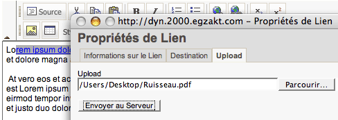 Allez dans l’onglet « Upload ». Pour envoyer votre document sur le serveur, cliquez sur le bouton « Parcourir » et sélectionnez-le. Pour confirmer le transfert, cliquez sur le bouton « Envoyer au serveur ».